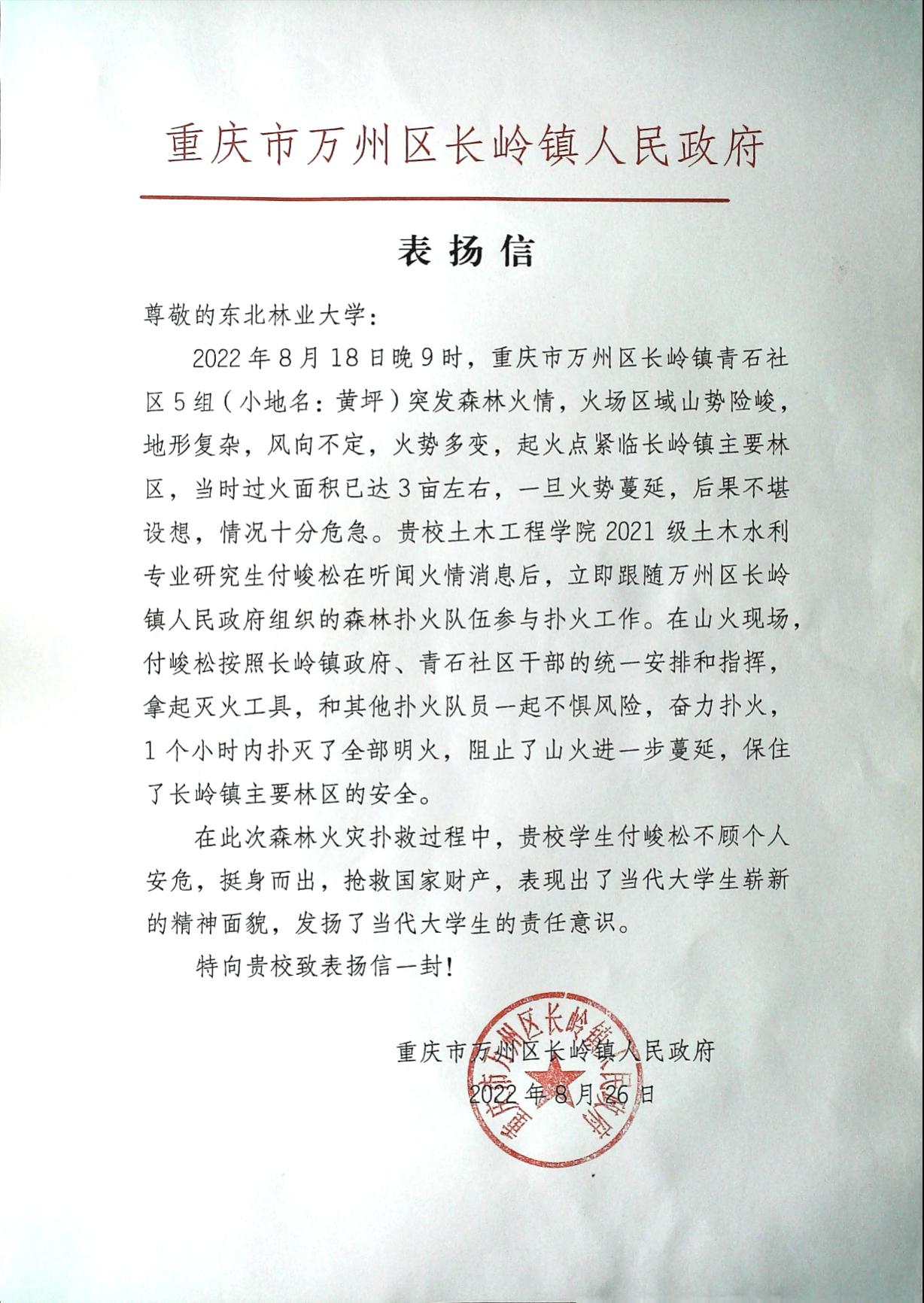 近日,我校土木工程学院收到了重庆市万州区长岭镇人民政府发来的表扬信,表扬我校2021级土木工程学院土木水利专业的付峻松同学在面对森林火灾发生时,不惧危险,主动请缨,与当地干部群众一起奋力扑火,阻止了山火进一步蔓延,保住了长岭镇上万亩林区的安全。