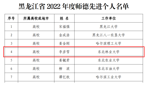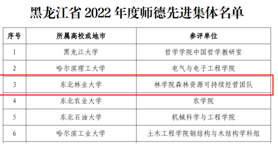 近日,黑龙江省教育厅下发《关于表彰2022年度全省师德先进集体和师德先进个人的决定》,我校林学院森林资源可持续经营团队荣获“黑龙江省2022年度师德先进集体”、园林学院李彦雪老师荣获“黑龙江省2022年度师德先进个人”。