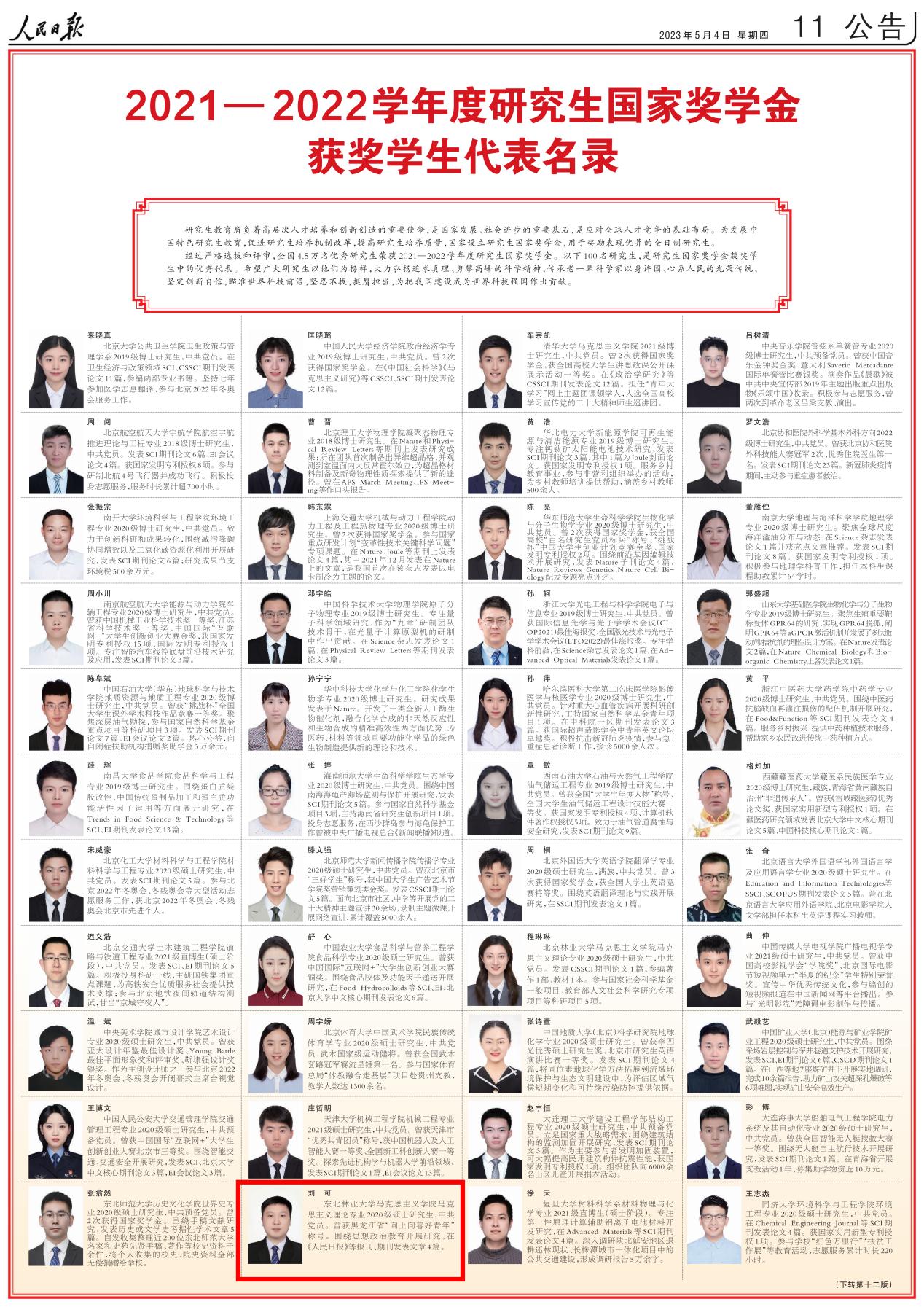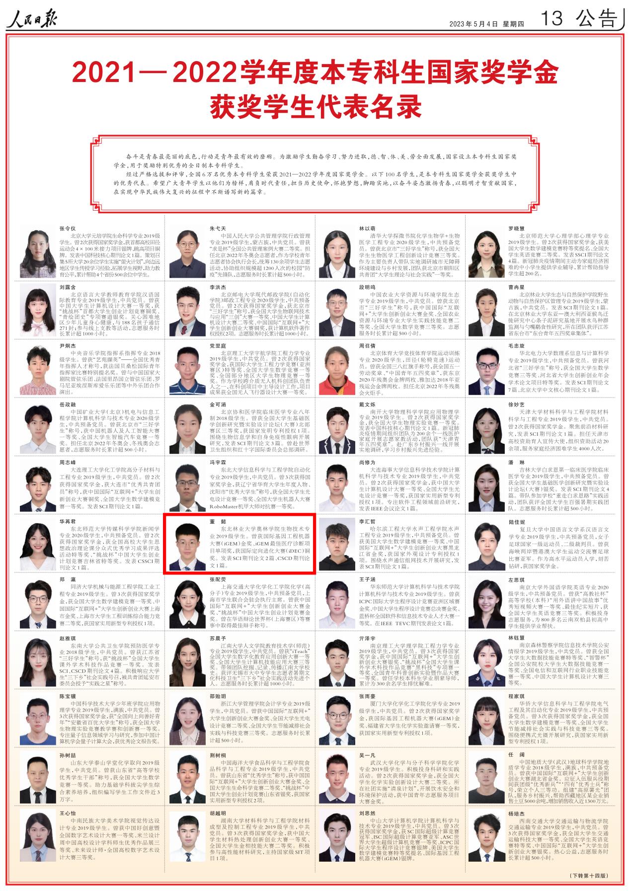 5月4日,《人民日报》刊登了100位2021—2022学年度本专科生国家奖学金获奖学生代表与100位2021—2022学年度研究生国家奖学金获奖学生代表,我校奥林学院2019级生物技术专业董懿和马克思主义学院2020级马克思主义理论专业刘可脱颖而出,名列其中。
