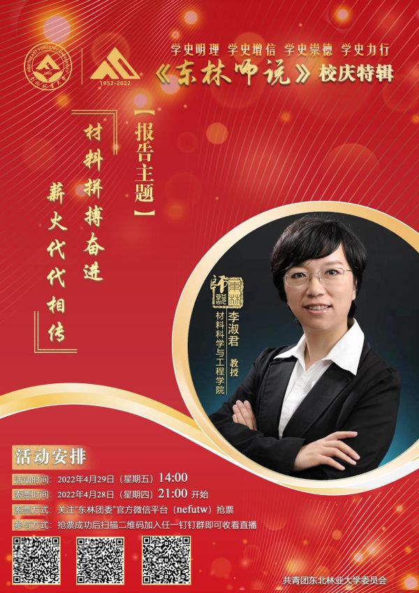 李淑君教授将结合自身工作经历,全面回顾学校、学院成立70年来的发展史和奋斗史,讲述材料科学与工程学院在学科建设、教育教学、学术科研等方面取得的丰硕成果,阐述学院“艰苦奋斗”、“创新发展”、“为民服务”、“初心不变”的“林工”精神,展望学院的发展前景与努力方向。