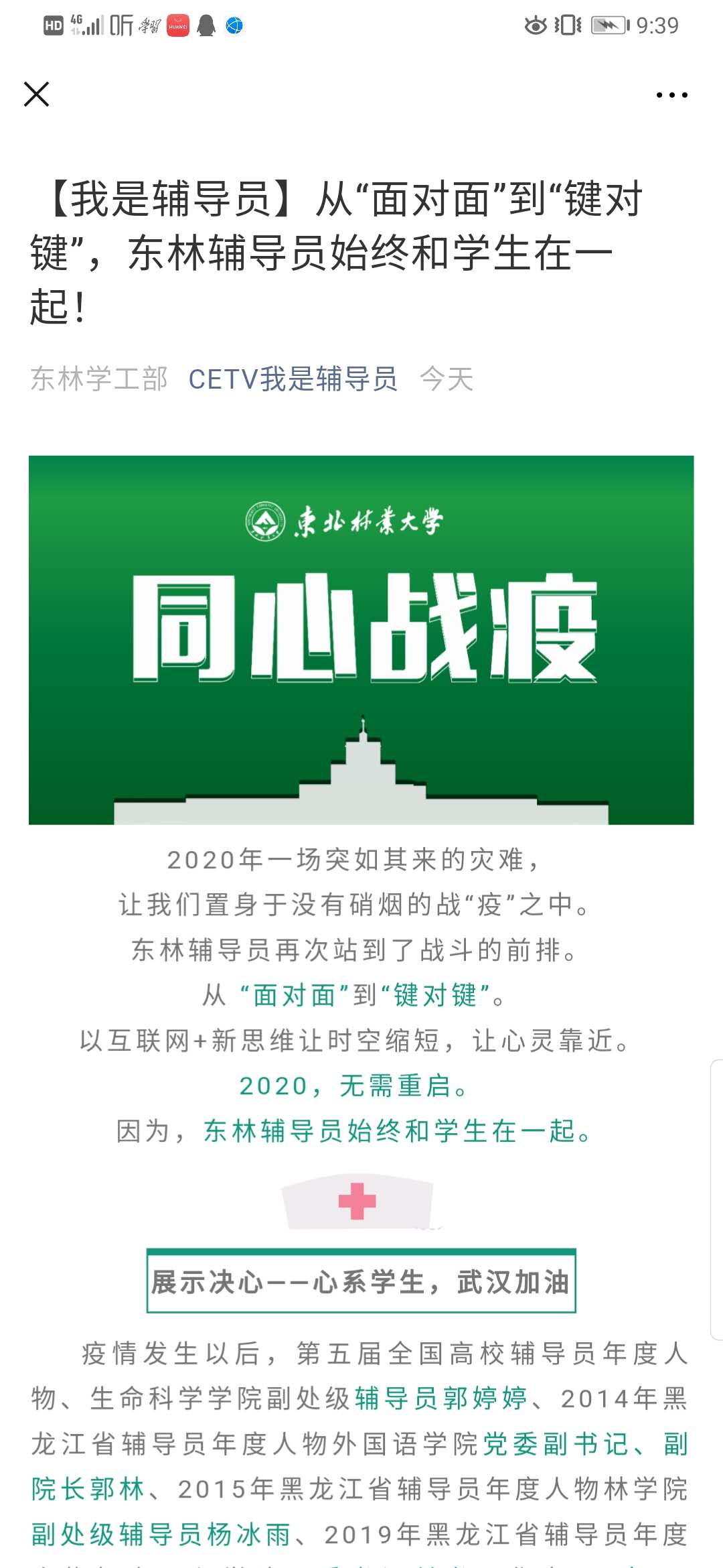 2月24日,中国教育电视台“我是辅导员”栏目官方微信公众号全文转载我校党委学工部辅导员抗击疫情工作纪实——《从“面对面”到“键对键”,东林辅导员始终和学生在一起!》。