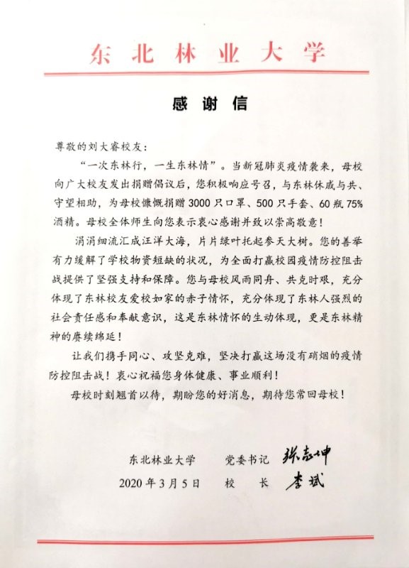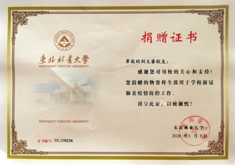 时时刻刻关注朋友圈和微信群的一切动向,一有卖口罩的人就立刻联系,多日的忙碌与奔波,他凭借着心中的信念与锲而不舍的精神已为东北林业大学捐赠了一大批医疗物资、为多所医院以及武汉的一些机构累计捐献了15批医疗物资。