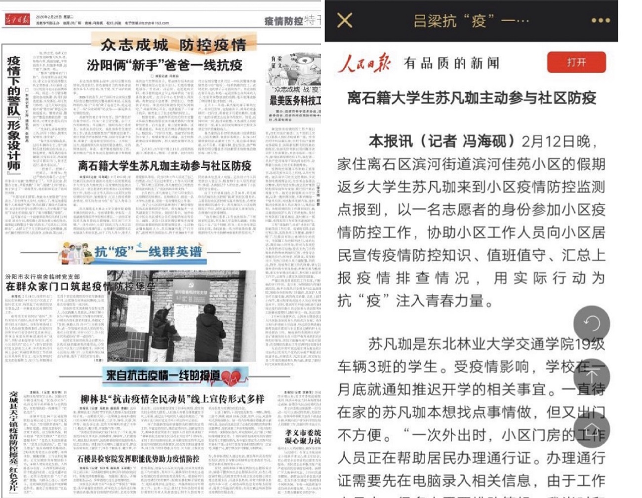 交通学院 2019 级车辆 3 班苏凡珈同学参与家乡社区防疫工作事迹被人民日报报道
