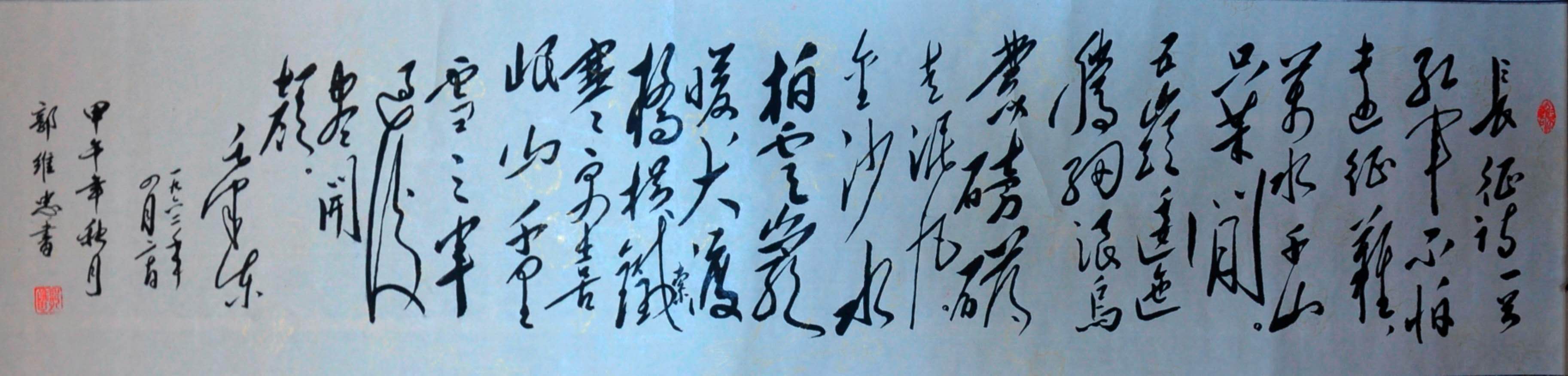 目前,郭维忠已经把这项工作纳入日程,他以饱满的热情一边收集一边挥毫,目前已写出近百幅,其中包括毛主席写给母亲的挽联,毛主席青年时期的对联警句等,其中的部分作品已在他举办的《纪念毛主席诞辰126周年作品展》中展出,他的作品饱含着对伟大领袖深深的爱和浓浓的情。