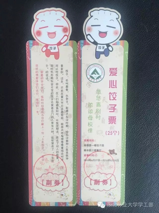 为了给同学们留个纪念,今年的饺子券特意设计了正券和副券两部分,同学们评券领取时只需要交副券,正券可以自己留存,还可以当书签使用哦!