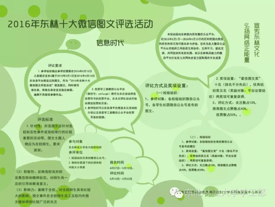 最后呢就是我们东林十大微信图文评选活动的结果了,在各大校院组织的努力下,微信平台建设日趋完善,微信图文水平有了显著提高。新媒体水平展现了当代大学生的精神面貌的一部分,快来看看获奖的名单里有没有你的组织吧~