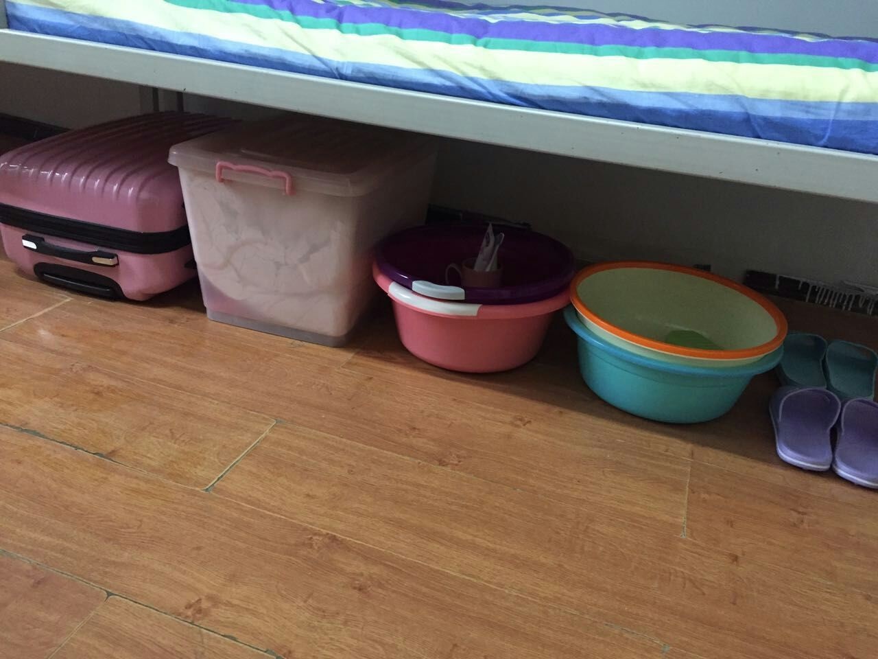 5.床下干净整洁。床下物品摆放整齐一致,只允许摆放两个行李箱(或整理箱)、两摞脸盆、两双拖鞋。摆放要求:以窗户方向为基准,依次摆放行李箱、脸盆、拖鞋(鞋尖朝墙),要求排成一排,贴床沿摆放。脸盆内洗漱用品要求摆放整齐一致,不可摆放除一个漱口杯(杯中可放置牙刷和牙膏)、一个洗面奶或香皂以外的任何用品。床下所有物品不得超出床沿。床隙(床与床之间的空隙)不可有任何物品。
