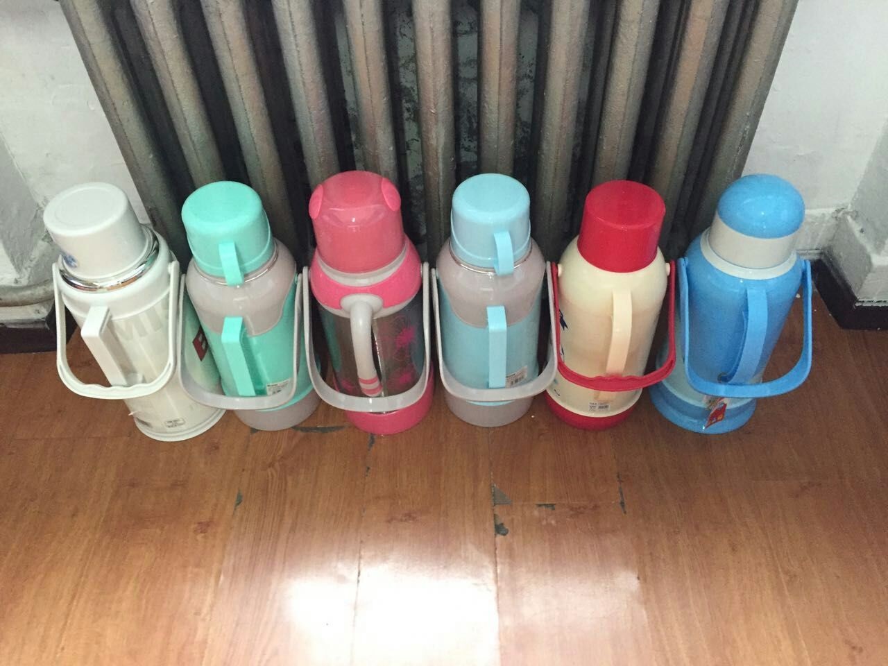 2.暖瓶在暖气片前摆放成一线,且把手朝门。