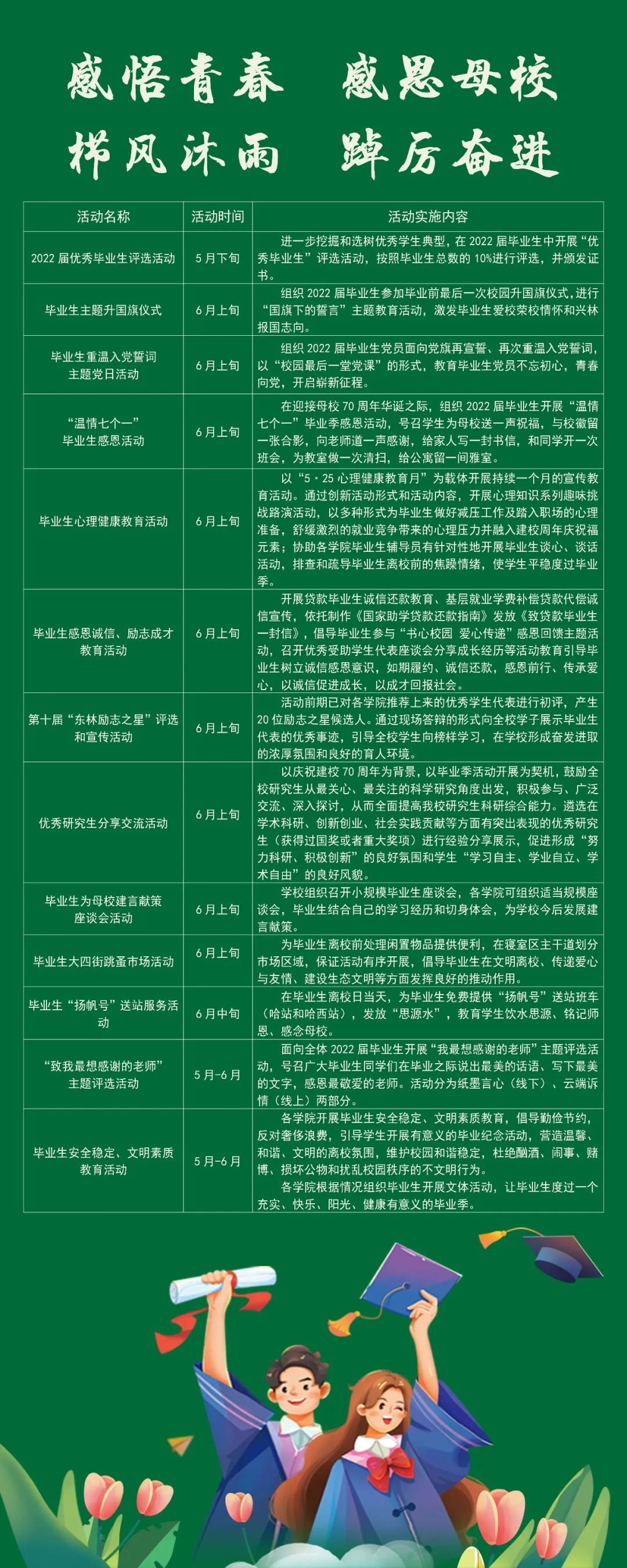 以打造温情毕业季为“课程主题”,线上线下相结合,设立以“理想信念教育、爱校荣校教育、文明素质教育、安全稳定教育、心理健康教育、生命智慧教育、感恩诚信教育、励志成才教育、遵纪守法教育、社会责任教育”等教育内容为核心的“课程体系”,不断丰富“课程形式”,为毕业生讲好大学生活“最后一课”,努力培养堪当民族复兴重任的时代青年。