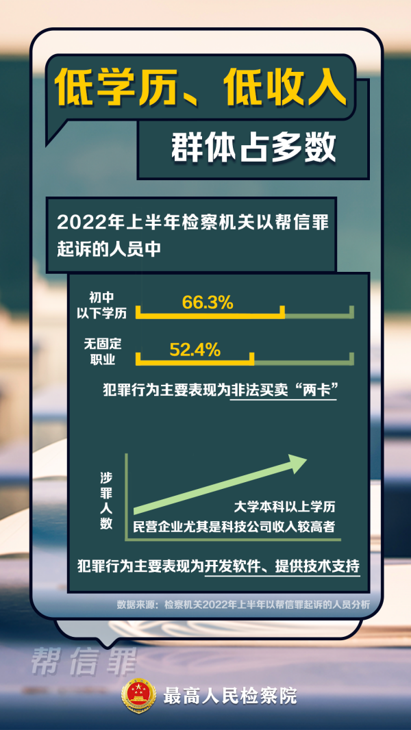 近年来,特别是2020年10月“断卡”行动以来,检察机关起诉涉嫌帮信犯罪案件上涨较快,目前已成为各类刑事犯罪中起诉人数排名第3的罪名(前两位分别是危险驾驶罪、盗窃罪)。检察机关坚持以习近平法治思想为指引,深入贯彻宽严相济刑事政策和少捕慎诉慎押刑事司法政策,依法惩治帮信犯罪,2022年上半年起诉帮信犯罪6.4万人,有力促进电信网络犯罪源头打击治理。办案发现,这类犯罪案件高发反映出的社会治理问题也值得关注。