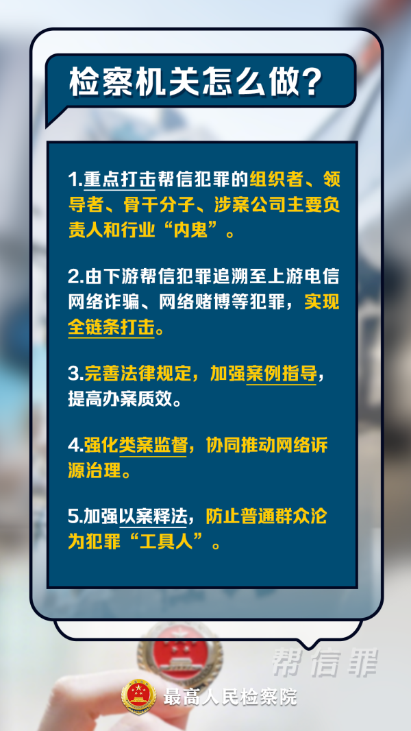 针对办案中反映的趋势问题,检察机关坚持宽严相济,在依法全链条惩治帮信犯罪的同时,强化类案监督,推动诉源治理,深化以案释法,筑牢帮信犯罪社会防线。