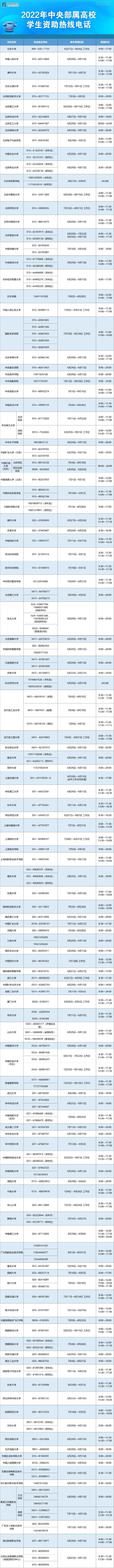 为帮助广大学生和家长及时准确了解国家资助政策,确保家庭经济困难学生顺利入学并完成学业。除了短信中提到的教育部热线电话外,各地学生资助管理中心和各中央部属高校也开通了暑期热线电话,小助附上一览表: