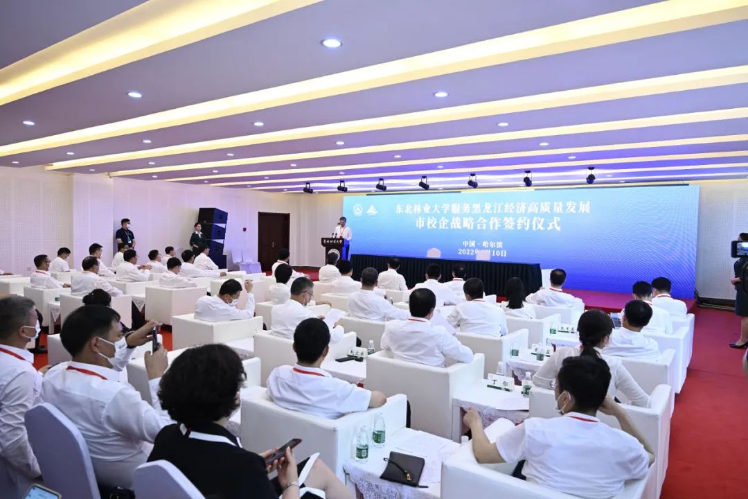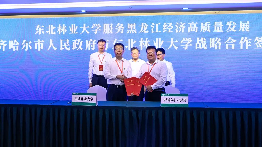 在黑龙江省副省长孙东生、地方政府领导、东北林业大学党委书记张志坤的共同见证下,东北林业大学与齐齐哈尔市人民政府、牡丹江市人民政府、佳木斯市人民政府、大庆市人民政府、鸡西市人民政府、双鸭山市人民政府、伊春市人民政府和黑龙江伊春森工集团、七台河市人民政府、鹤岗市人民政府、黑河市人民政府、绥化市人民政府、大兴安岭地区行署和大兴安岭林业集团、中国第一重型机械集团、中国龙江森工集团、哈尔滨新光光电科技有限公司签署合作协议。签约合作内容涉及人才培养、科技成果转化、学生就业创业、基地建设等多个方面。