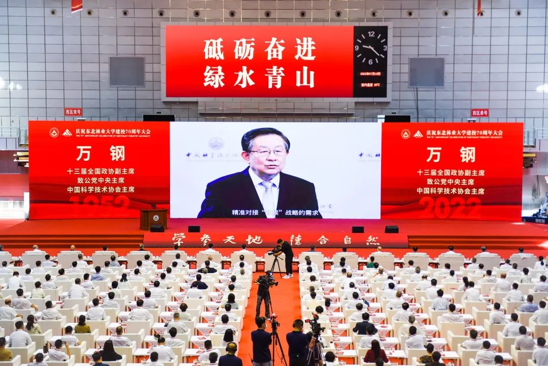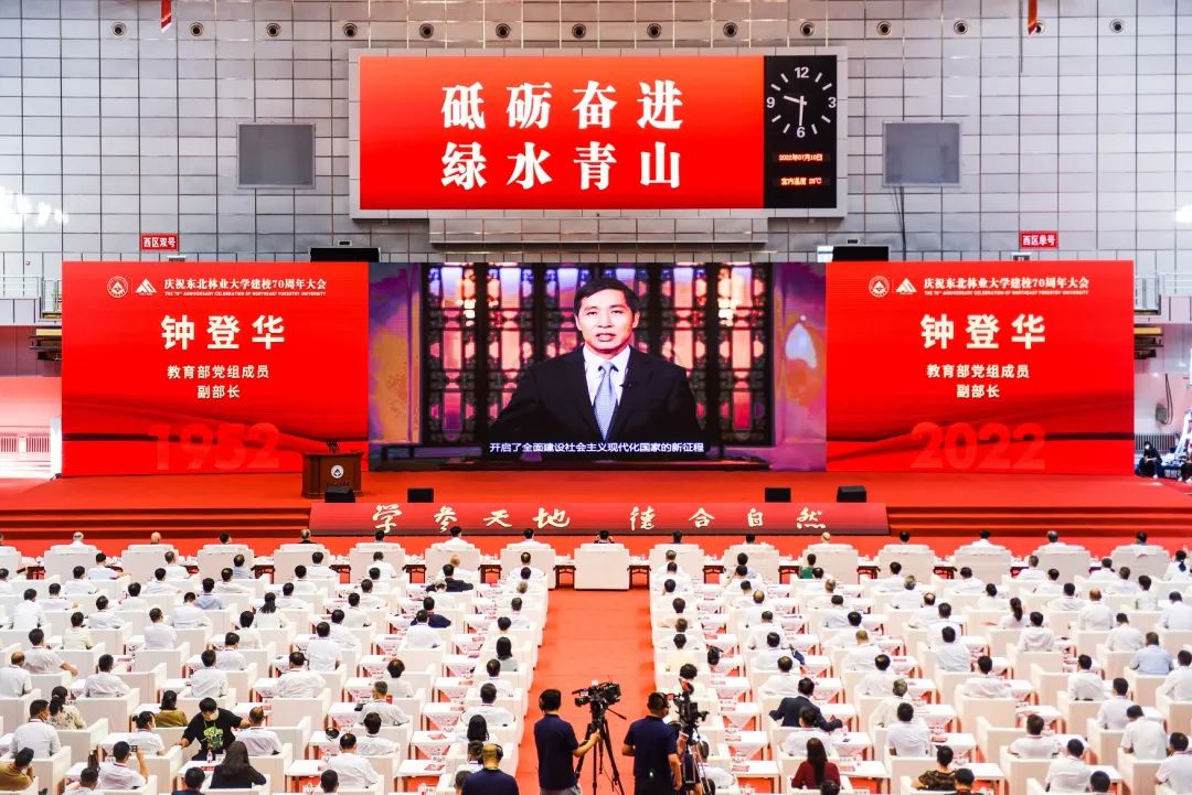 钟登华通过视频发表致辞。他对东北林业大学70年在林业建设、生态文明建设、经济社会发展中所做出的重要贡献,所取得成就表示了肯定,希望东北林业大学以建校70年为起点,立足“两个大局”,心怀“国之大者”,把握大势,敢于担当、善于作为,努力开创高质量发展新局面。他对学校提出三点希望,坚持党的全面领导,牢牢把握社会主义办学方向;坚持立德树人,奋力培养堪当重任的时代新人;坚持扎根东北,不断提升服务国家的能力和水平。