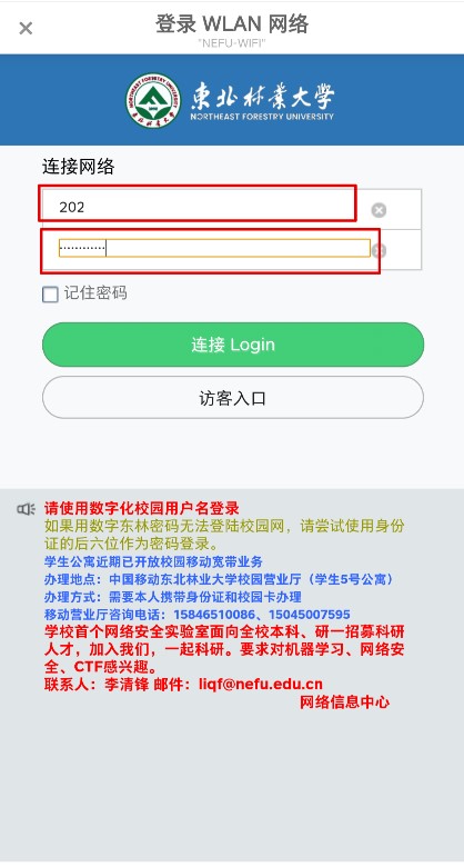 新用户账号注册。在公共区域(除学生公寓以外地区)如办公区、教学区、图书馆、食堂等,连接无线网信号NEFU-WIFI,连接成功后在弹出的认证界面中输入账号密码,如图1所示。账号为数字东林账号(与校园卡卡号相同),密码为数字东林密码。