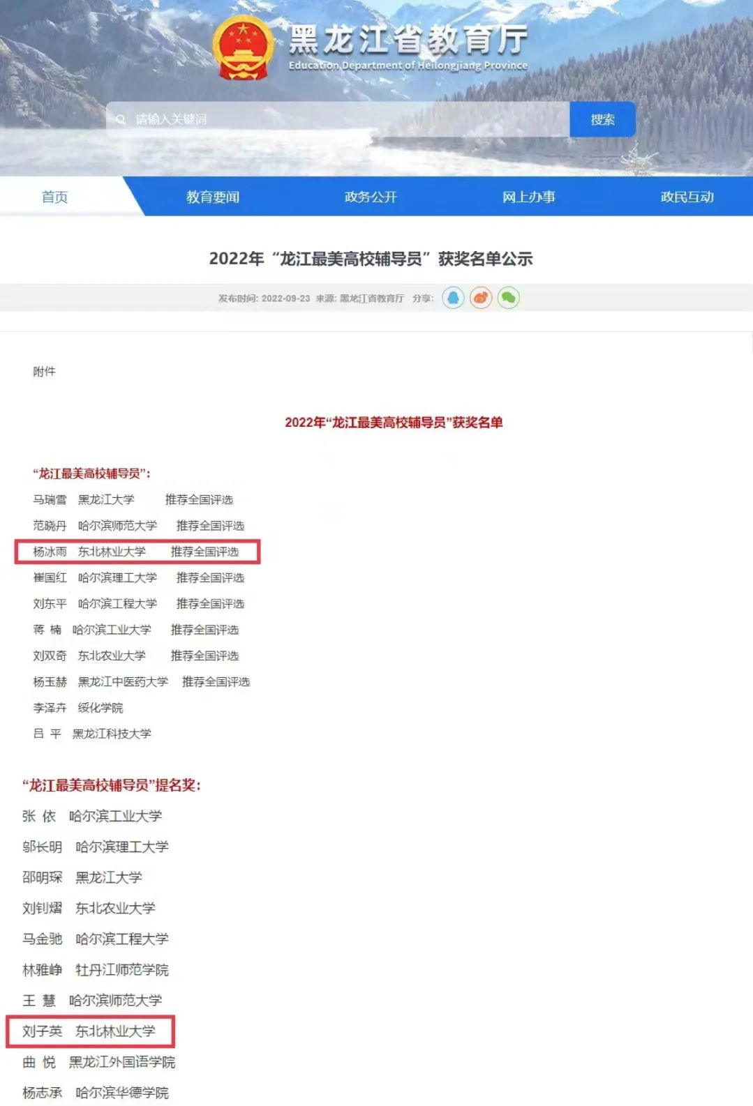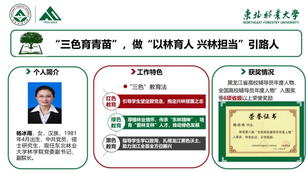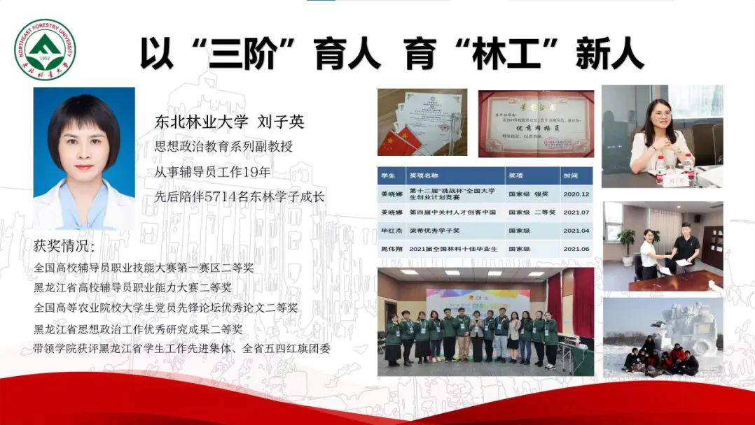 近日,2022年“龙江最美高校辅导员”推选展示活动落下帷幕。我校林学院党委副书记、副院长杨冰雨获评2022年“龙江最美高校辅导员”,并被推荐代表龙江辅导员参加全国评选;我校材料科学与工程学院党委副书记、副院长刘子英获2022年“龙江最美高校辅导员”提名奖。