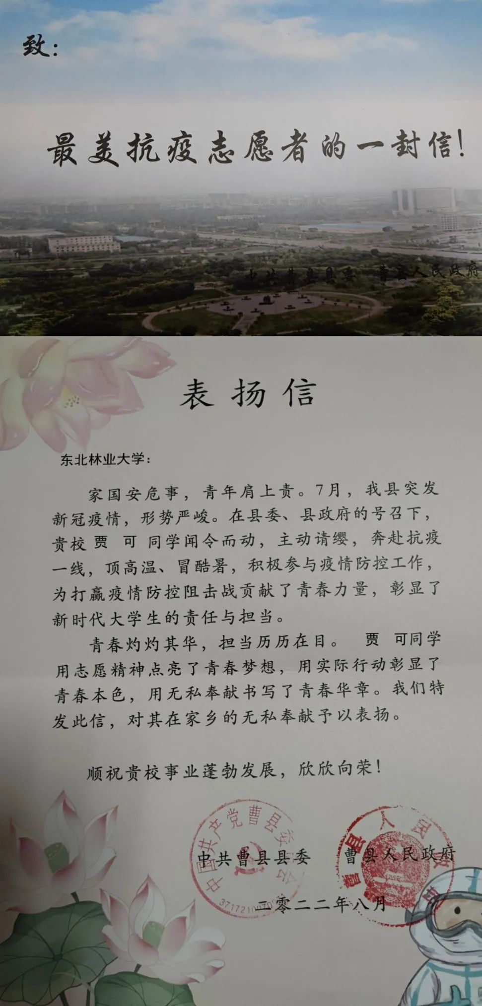 “疫字当头,义不容辞”,尽微薄之力,不负青春,不留遗憾。材料院贾可同学,在家乡疫情爆发的情况下,作为一名东林学子,她谨记母校和师长的谆谆教导,谨记东林人的责任与担当。在县政府和镇政府的共同号召下,主动报名加入志愿者队伍,投身抗疫前线,为家乡疫情防控工作筑牢坚实堡垒。一份荣誉,一份担当,抗疫期间,贾可同学任劳任怨、无私奉献、恪尽职守的精神感染着周围的人们,凸显出特殊时期“东林精神”的时代内涵,贾可同学抗疫期间的付出获得了县政府的充分认可,并收到了来自县政府颁发的志愿者证书和感谢信。