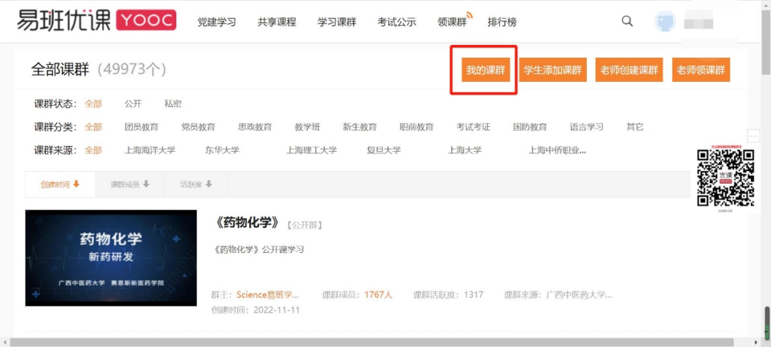 点击右上角头像,出现下拉菜单,点击“我的课群”