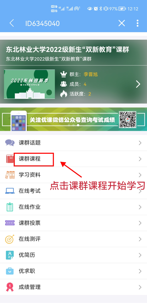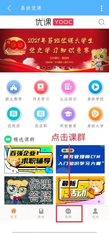 点击“易班优课”,进入“课群”页面,在“我的课群”栏目”点击“添加课群”,输入课群邀请码,选择所在学院对应的课群小组,进入小组后点击课程即可开始学习。