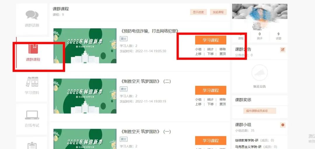点击左侧导航栏中的课群课程,再点击“学习课程”即可开始学习。
