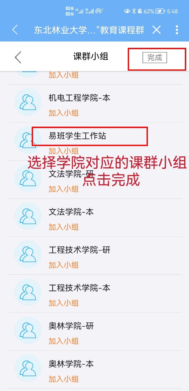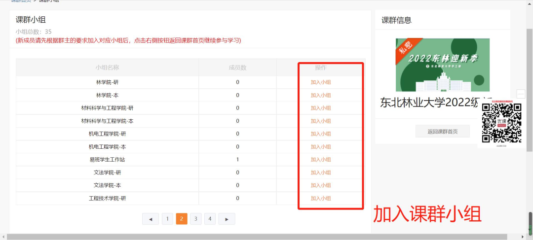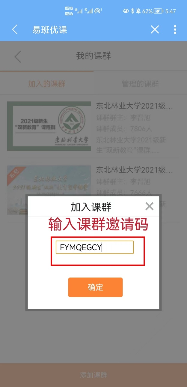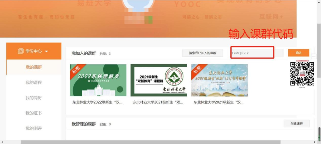 点击“添加课群”,输入课群邀请码FYMQEGCY,点击确认,加入课群,并选择自己所在学院所对应的课群小组点击加入小组。