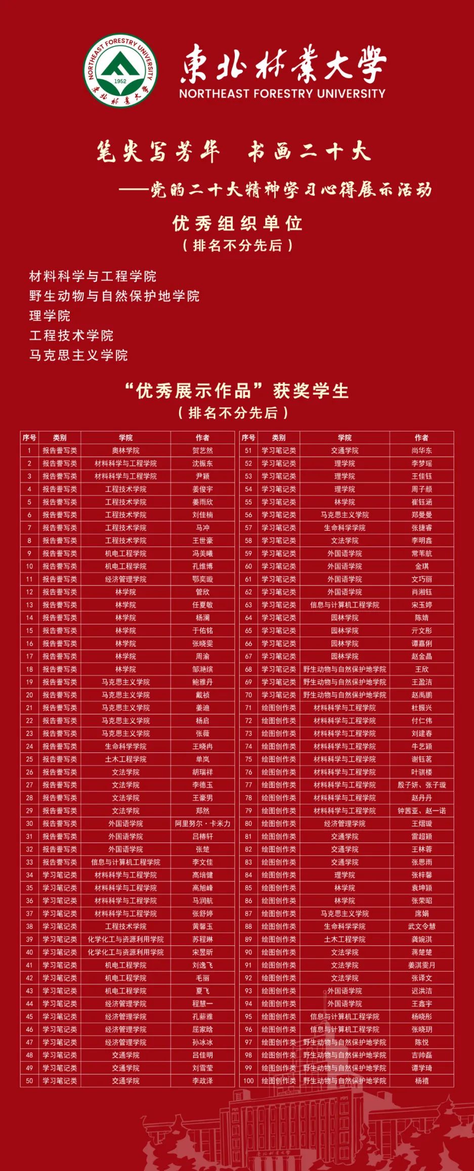 恭喜以上获奖同学,活动主办单位将会为获奖单位和个人颁发证书和奖品,优秀作品将通过“东北林业大学学工部”微信公众号陆续展示,敬请关注。