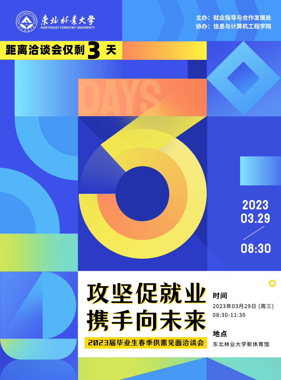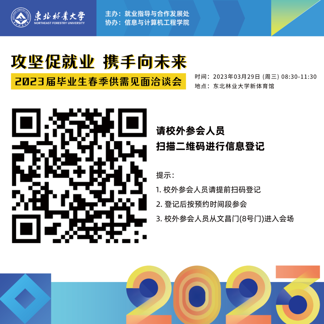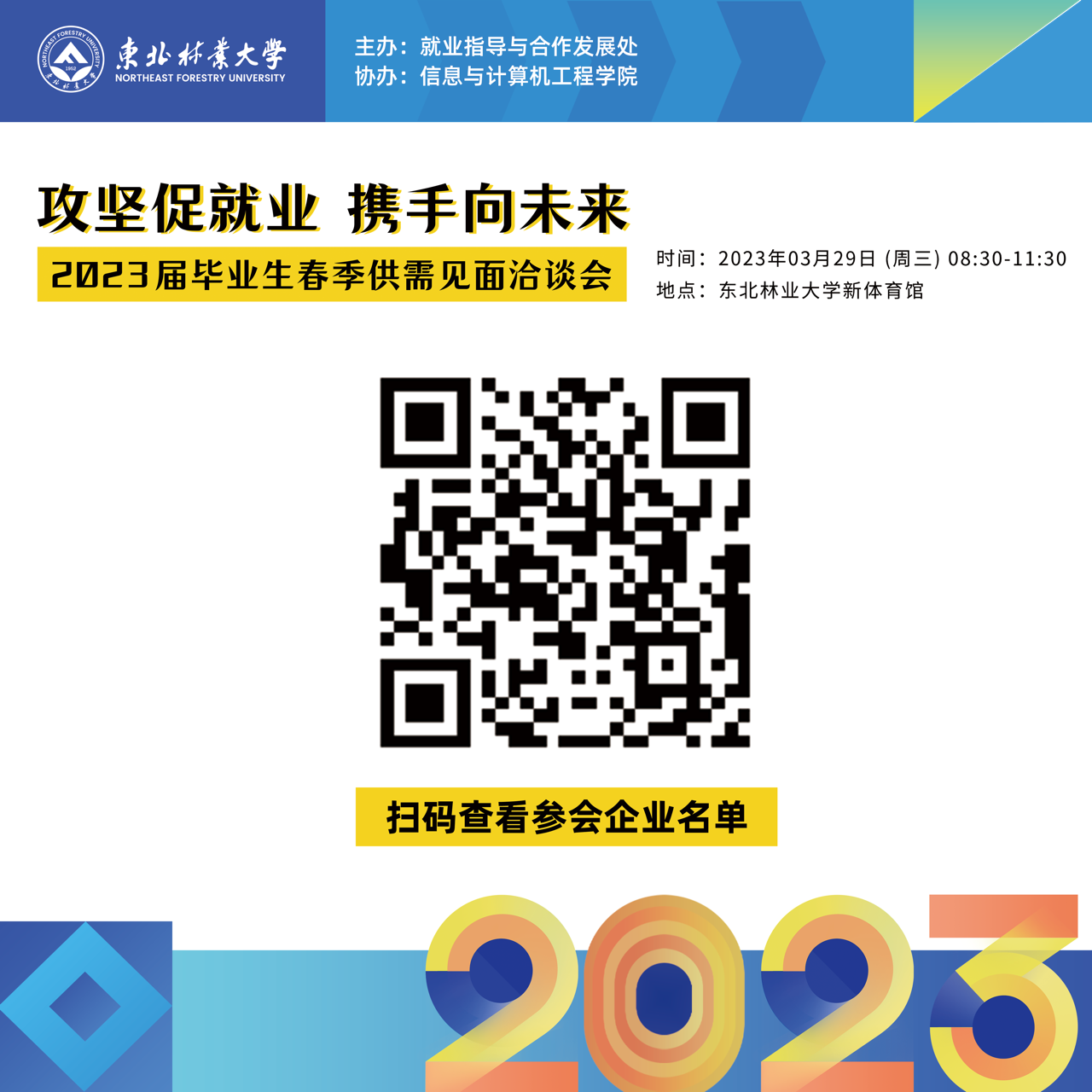 为深入学习贯彻党的二十大精神,全面落实党中央、国务院对高校毕业生就业工作的决策部署,进一步深化与各用人单位间的交流合作,为用人单位和毕业生搭建高效的“双向选择”平台,东北林业大学将于2023年3月29日举办2023届毕业生春季供需见面洽谈会,本次洽谈会预计有260余家企业参会,提供18000余个招聘岗位。