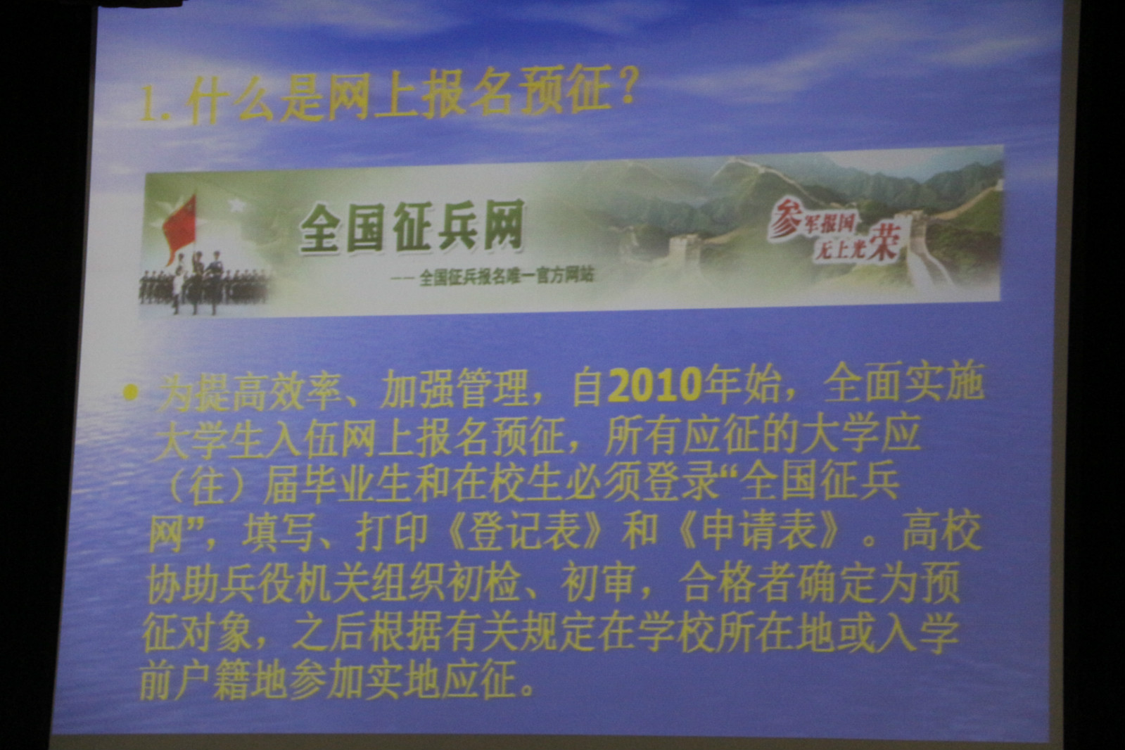 陈老师细心的为学生们讲解应征入伍三大基本条件:政治、身体、年龄以及报名时间、报名地点、入伍流程。