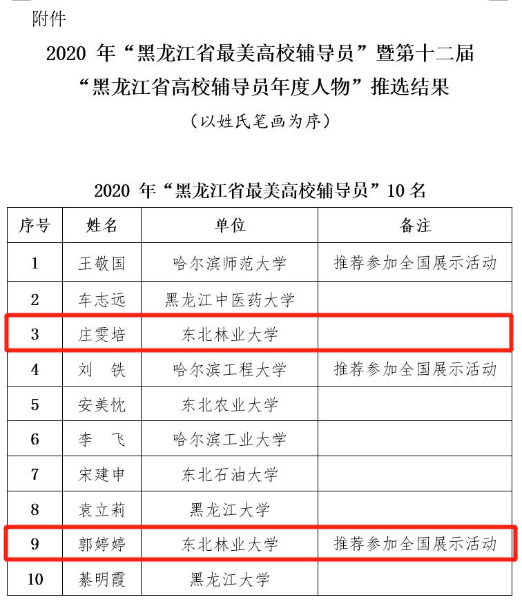 “最美高校辅导员”和“高校辅导员年度人物”评比,每年举行一次,由教育部思想政治工作司主办、中国高等教育学会辅导员工作研究分会承办,是国家层面辅导员个人最高荣誉,也是各高校辅导员队伍建设水平和层次的标志。自2009年以来,我校从未缺席黑龙江高校辅导员年度人物入选名单,累计10人获得此项荣誉,其中3人获得全国高校辅导员年度人物入围奖、1人获得提名奖,郭婷婷获评第五届全国高校辅导员年度人物,受到习近平总书记的亲切接见,感人事迹被中国教育电视台等主流媒体报道。