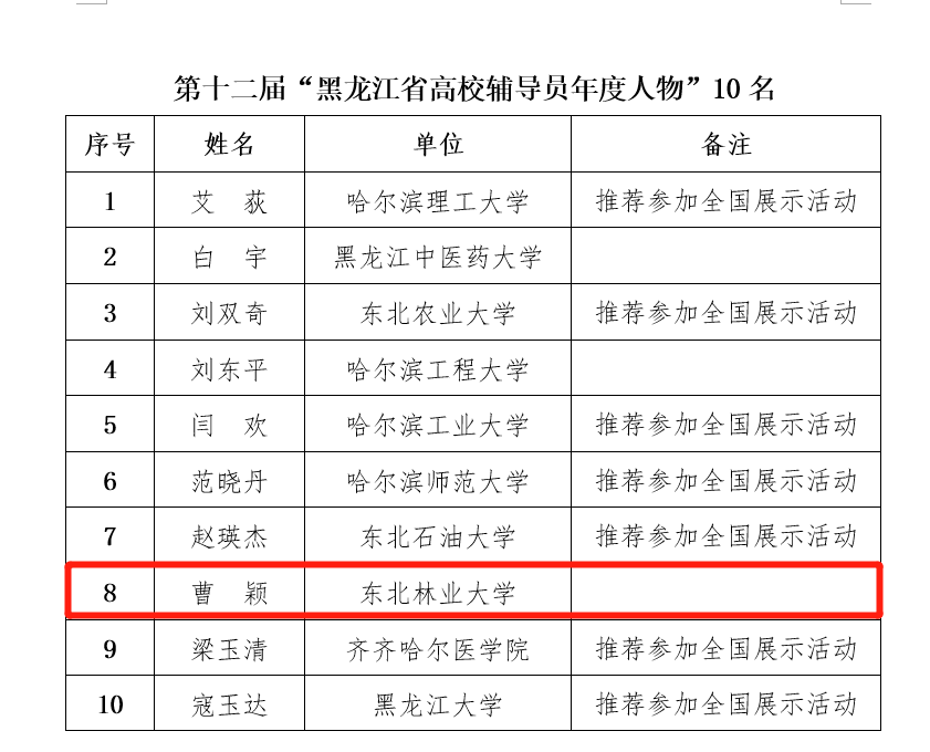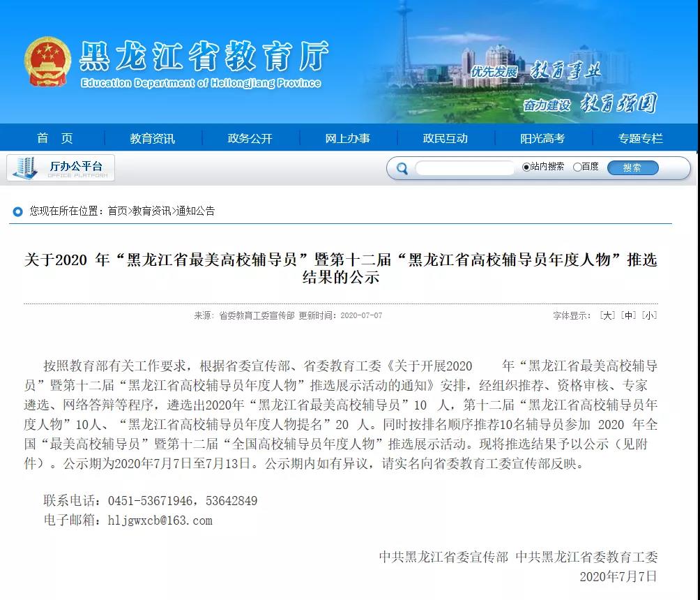 “最美高校辅导员”和“高校辅导员年度人物”评比,每年举行一次,由教育部思想政治工作司主办、中国高等教育学会辅导员工作研究分会承办,是国家层面辅导员个人最高荣誉,也是各高校辅导员队伍建设水平和层次的标志。自2009年以来,我校从未缺席黑龙江高校辅导员年度人物入选名单,累计10人获得此项荣誉,其中3人获得全国高校辅导员年度人物入围奖、1人获得提名奖,郭婷婷获评第五届全国高校辅导员年度人物,受到习近平总书记的亲切接见,感人事迹被中国教育电视台等主流媒体报道。